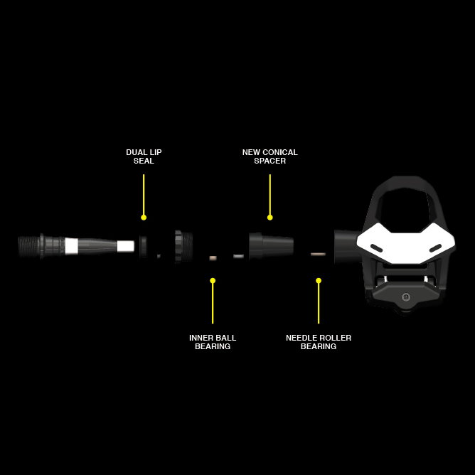 A new component has been added between these two bearings. A serrated washer, previously used to hold the needle roller bearing in place, has been replaced with a conical spacer. This technical solution reduces friction, increases fluidity, and by consequence, decreases the geometrical tolerances of the pedal body and play.