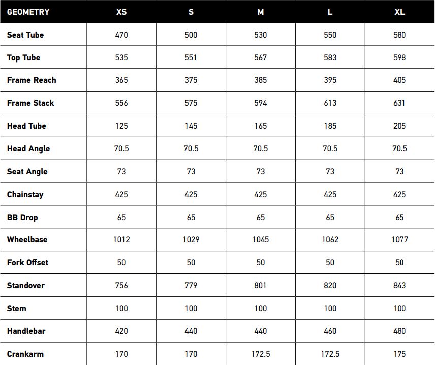 - Chainset SRAM APEX 1 42T, XS/S = 170MM, M/L = 172.5MM, XL = 175MM