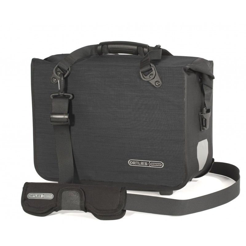The waterproof bike briefcase with roll closure can be mounted on the right or left side of the rack. It can be quickly mounted and easily taken off the rack single-handed. The Office-Bag offers room for two large A4 files (size L), office supplies, mobile etc.