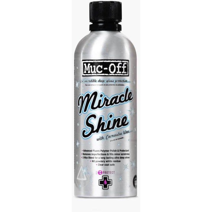 Let’s not beat around the bush, you want a high quality polish and protectant that delivers a deep and luxurious shine for your bodywork or frame, Muc-Off Miracle Shine is the product for that job. Not only does our Miracle Shine give you amazing reflective results – but it also covers the treated areas with a microscopic protective layer against atmospheric pollutants, thanks to it’s Fluoro Polymer Technology!