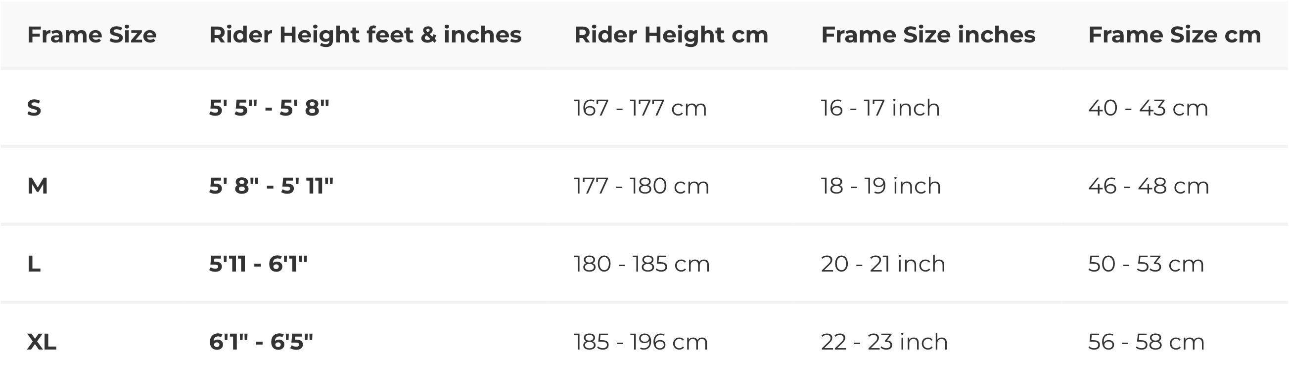 BIKE SIZE CHART