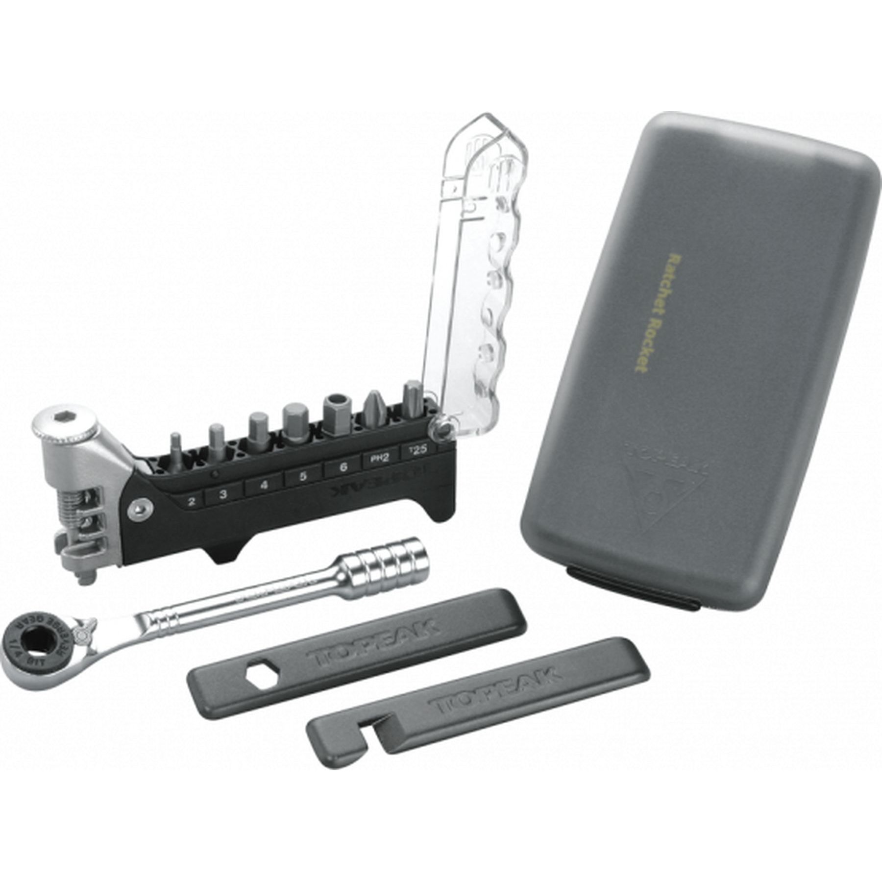 Mini-tool convenience with the speed of a reversing ratchet. The Ratchet Rocket features a fine tooth ratchet mechanism with reverse lever & thumb wheel for quick rotation and control in tight spots. Nine hardened steel bits plus a hollow bit for snapping Shimano chain pins.