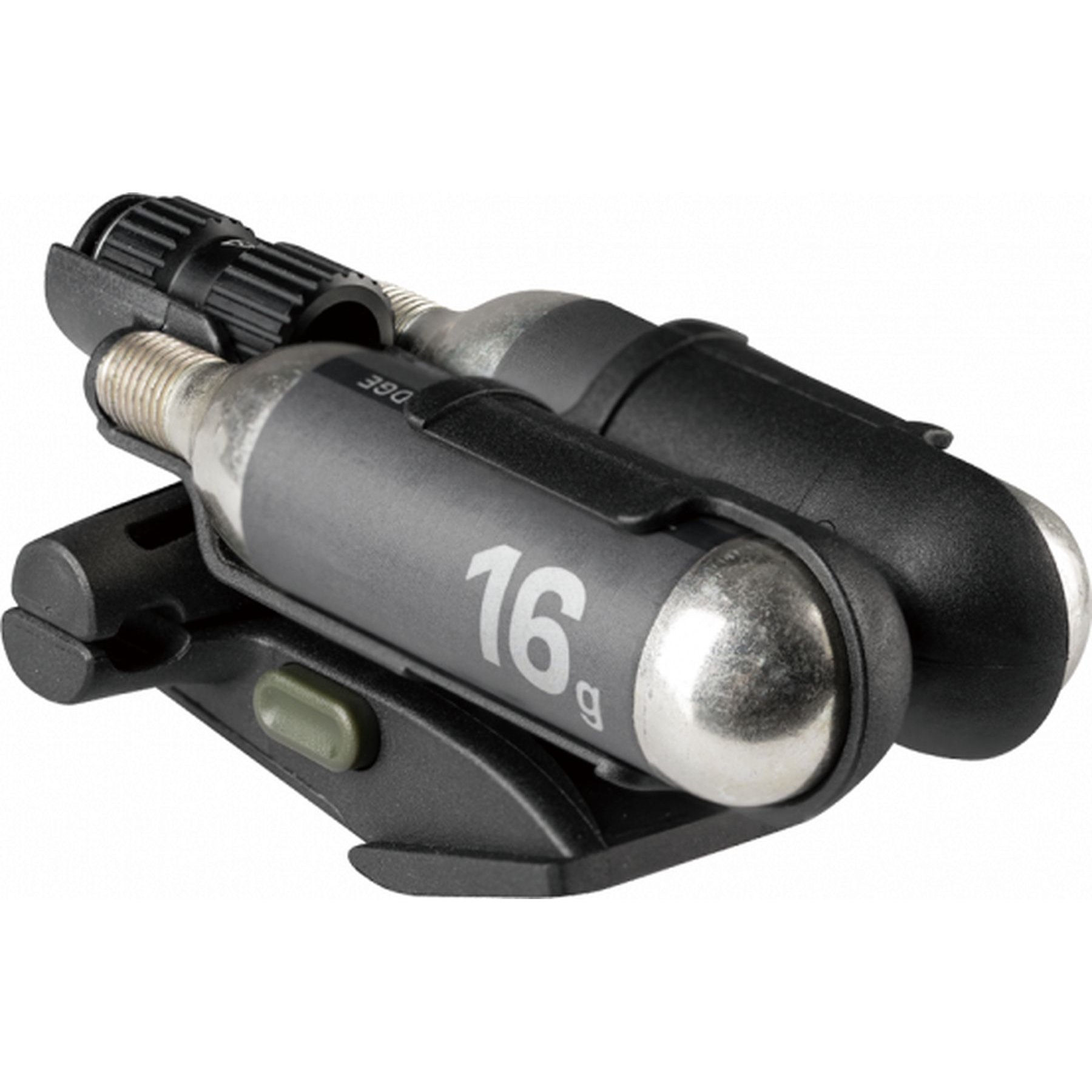 Ultra compact CO2 inflation kit featuring a Nano AirBooster CO2 inflator and two 16g CO2 cartridges. Mounts to saddle rail with included Duo Fixer which provides dual use with Topeak Duo Fixer system accessories.