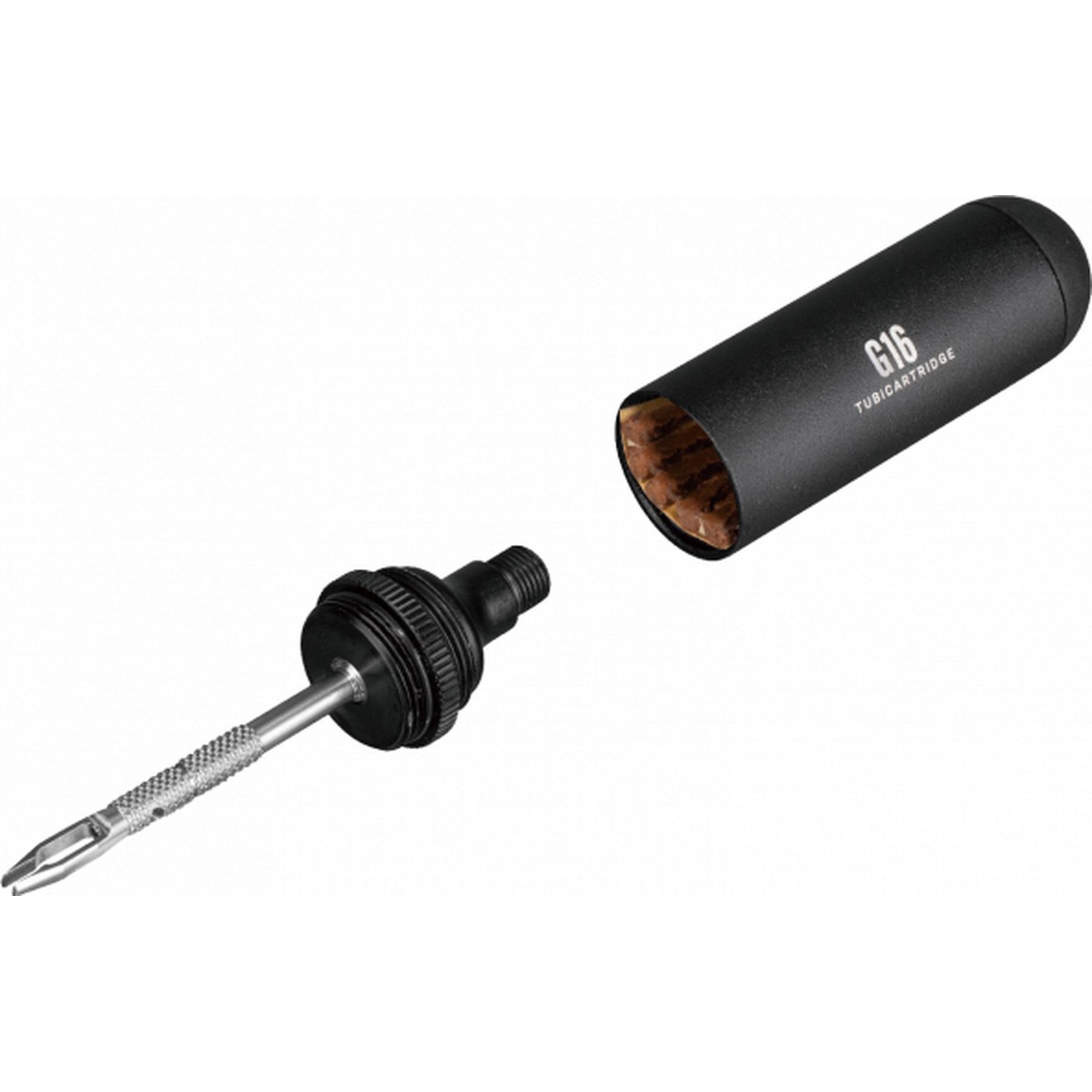 A gravel bike tubeless tire repair kit stored compactly in a CO2 cartridge style pod used alone for tire repairs or additionally with CO2 inflator for tire inflation. Mount to saddle rails or bike frame with HybridMaster Mini, TubiMaster GX DF, NanoMaster DF, or TubiMaster GXT Bolt-on for a complete tubeless tire repair and/or inflation solution.