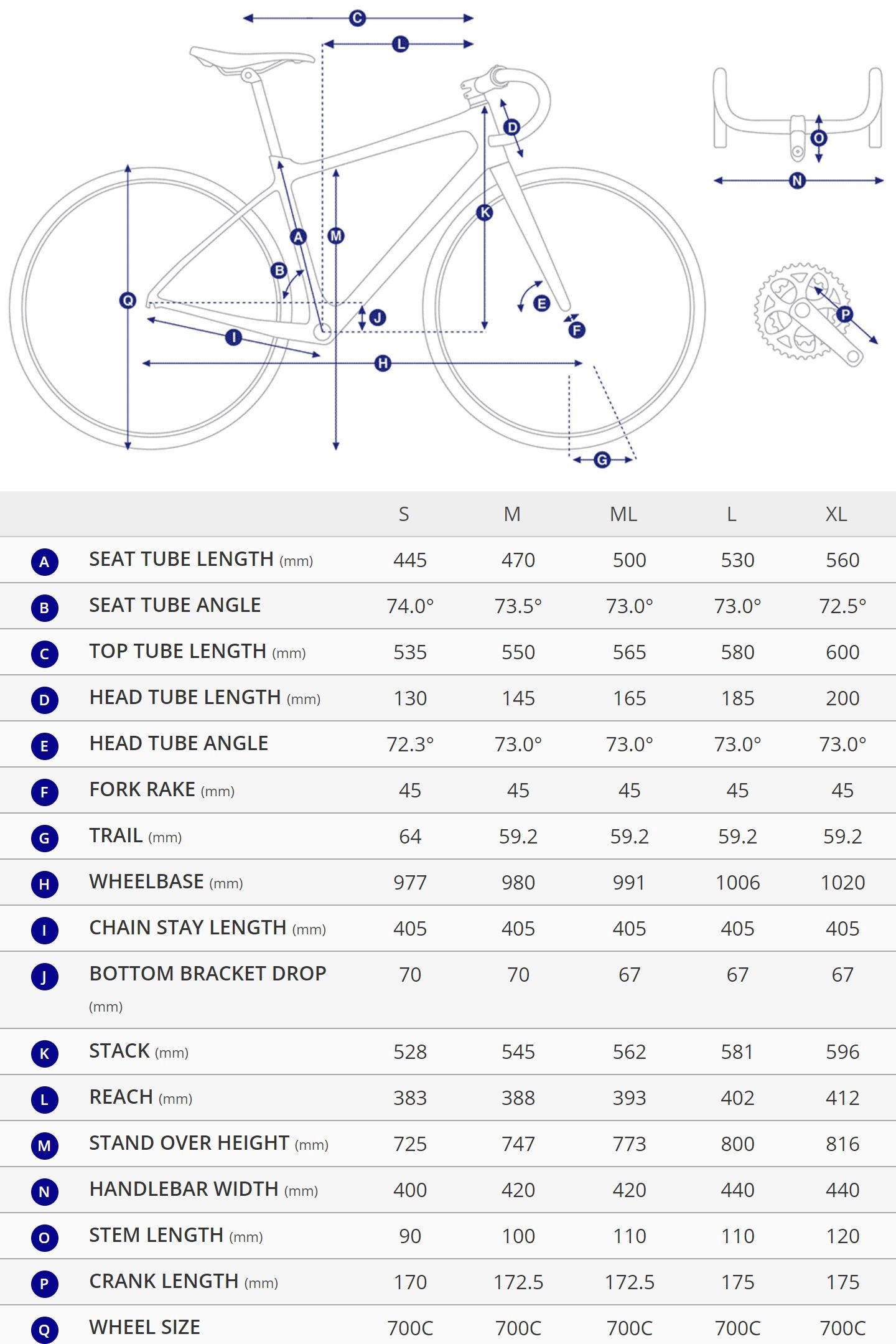 - Crankset: Shimano 105, 34/50 XS:170mm, S:170mm, M:172.5mm, M/L:172.5mm, L:175mm, XL:175mm