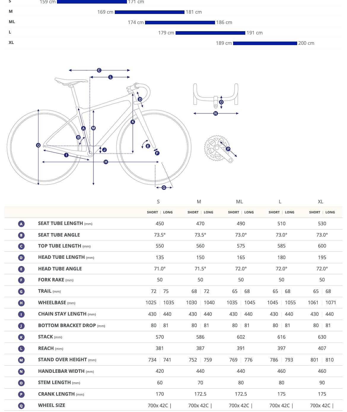 - Crankset: Shimano GRX RX-820, 31/48 S:170mm, M:172.5mm, M/L:172.5mm, L:175mm, XL:175mm