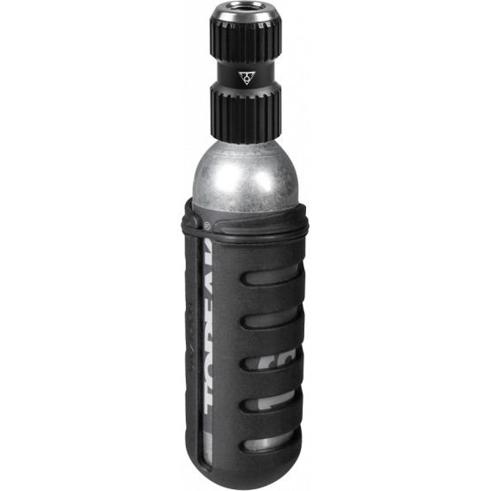 An extremely compact, lightweight and easy-to-use CO2 inflator. Precision CNC machined aluminum inflator fits Presta and Schrader valves and works with threaded 16g or 25g cartridges. Simply screw the cartridge in tight and then screw the head onto the valve, unscrew the cartridge to release all the gas from the CO2 cartridge in seconds. Included CO2 Cartridge Shell protects your hands from cold cartridges during inflation.