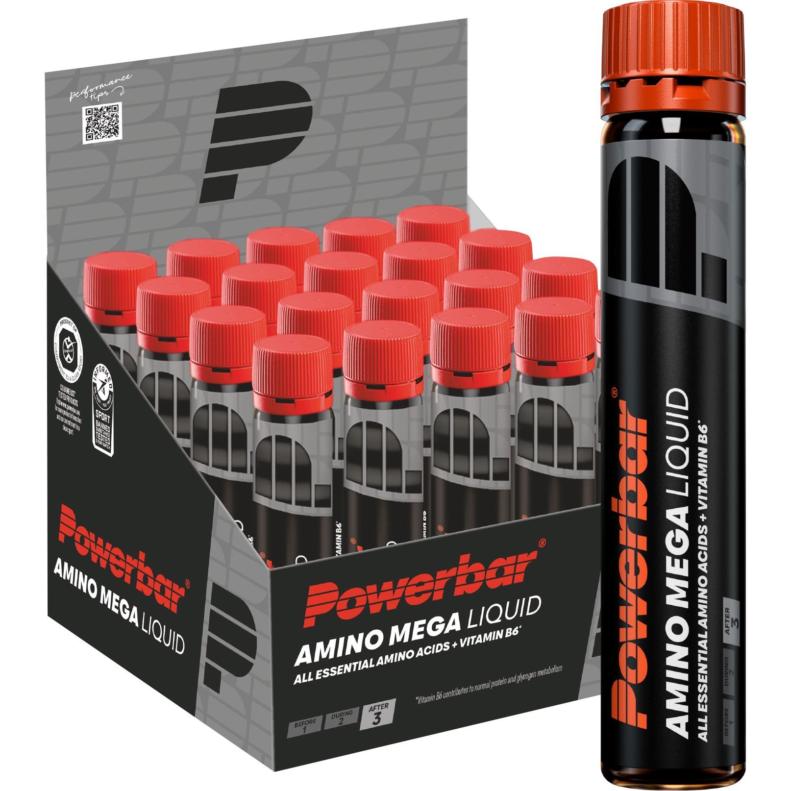 After intense endurance or strength training sessions, your muscles are exhausted. Protein is needed as a "building block" to help maintain and build muscle mass. Powerbar AMINO MEGA LIQUID contains high-quality, easily digestible whey protein hydrolysate and free amino acids. In addition, it also provides vitamin B6, which contributes to normal protein and glycogen metabolism. Due to its practical format, the ampoule fits in every pocket.