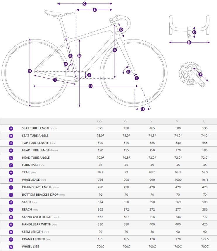 - Crankset: Shimano Sora, 34/50 XS:165mm, S:170mm, M:170mm,