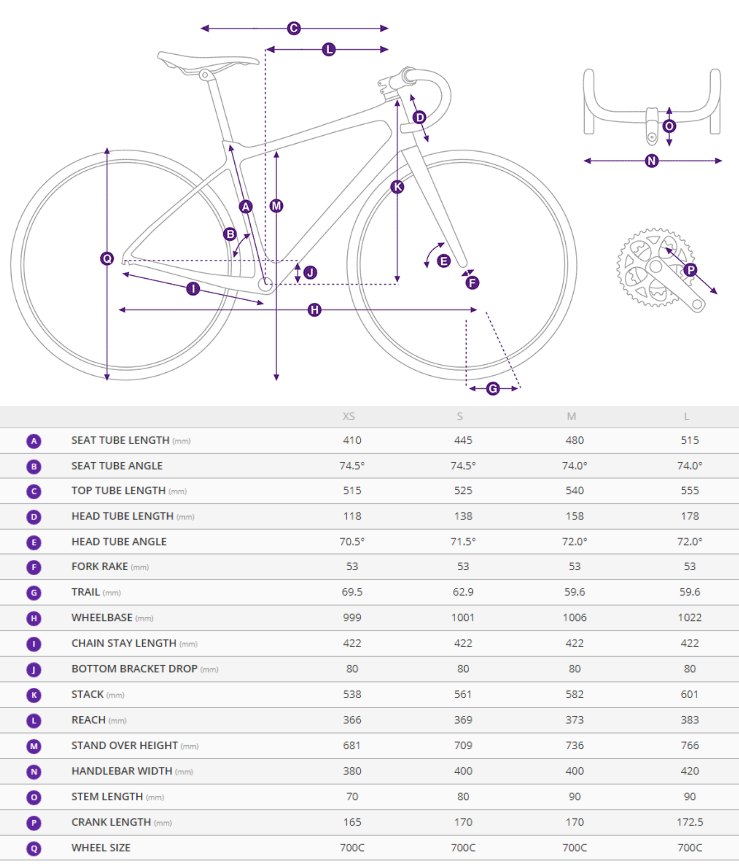 - Crankset: Shimano Sora, 34/50