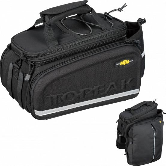 Dual molded side panels combine with flexible 600 denier fabric to form a semi-rigid, weather resistant trunkbag. Divided main compartment and side panels expand for extra storage capacity. Rear water bottle holder lets you carry more water on extended trips. Attaches to a rack with straps, or use the integrated plate to quickly and easily install a KLICKfix® / Racktime® Snapit or MIK® Adapter.