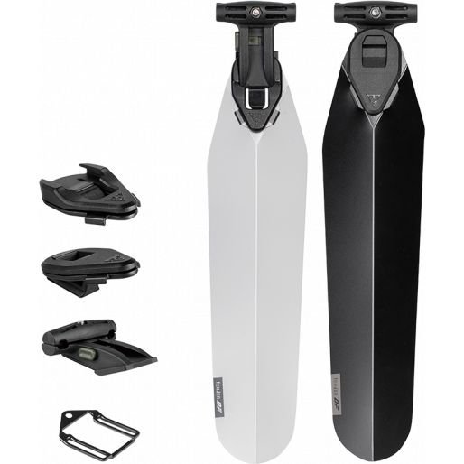 Durable polypropylene fender is ultralight, stylish, and simple to slide and click then ready to go when wet weather arrives. Included Duo Fixer allows fast and easy tool-free mounting and removal and provides dual use with Topeak Duo Fixer system accessories, including Topeak QuickClick saddle bags or most strap type saddle bags, Tubi tools, CO2 inflators, and lights underneath the saddle. Black and transparent colors with exchangeable upper and lower backets as a set for the color options and mounting position option to suit different needs.