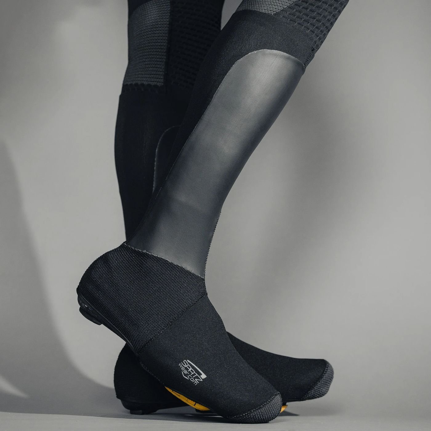 Designed as a two-part layering system, the Pro Stealth Overshoes ship together with the Protoez Toe Warmers. The Pro Stealth Overshoes can be worn alone over cycling shoes in temperatures over 3-5 degrees centigrade. Any colder and we recommend the Protoez toe warmers should be added underneath the overshoes. When the Pro Stealth Overshoes and Protoez Toe Warmers are worn together, the cleverly designed silicone seals (on the inside and outside of the toe warmers) integrate perfectly with the seals on the inside of the overshoes, forming a barrier which drastically reduces the ingress of moisture and creates insulation which is unmatched in a cycling overshoe.