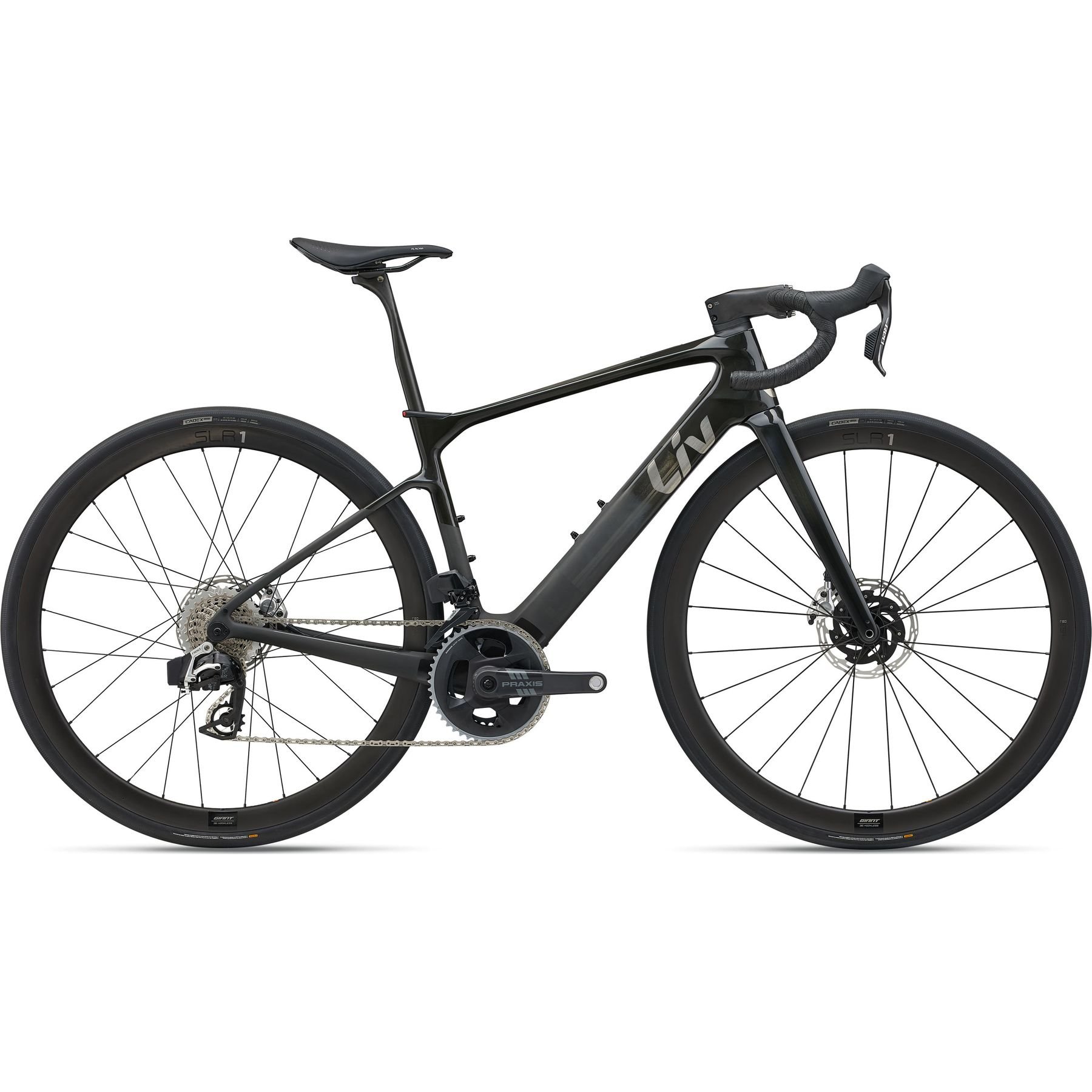 - Rims: Giant SLR 1 E+ 36 Carbon Disc Wheel System, Hookless, Tubeless Ready, 12mm thru-axle, w/ Sapim spoke E-Light [R] CX-Ray [F], e-bike optimised