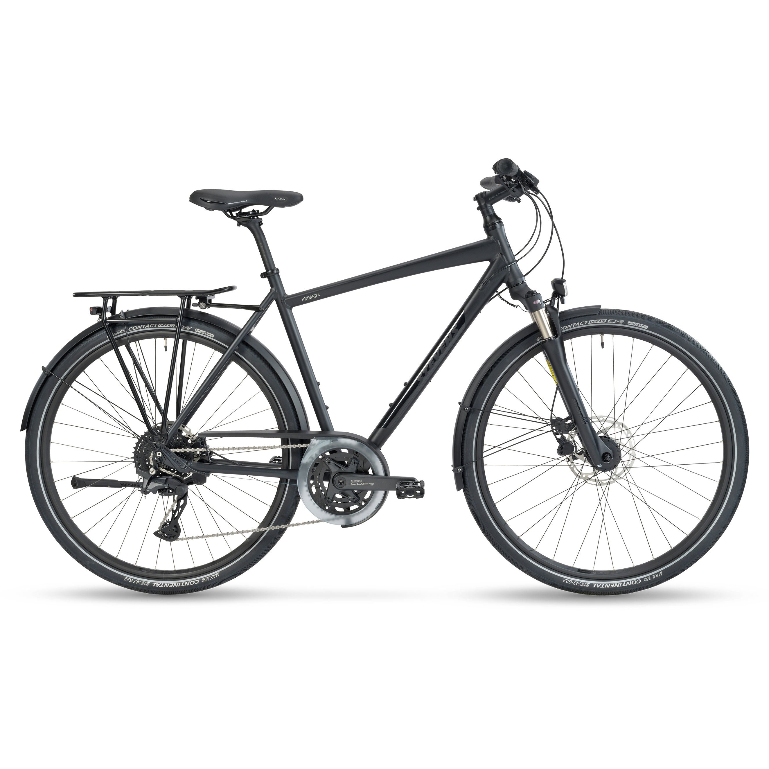 Will it be a leisurely ride through the fields? Then go ahead with full suspension travel. 63 millimetres is perfect. Or will it be a fast ride over hilly roads? The lockout immobilises the spring - and allows Primera riders to enjoy the efficiency of the lightweight aluminium frame unfiltered. The hydraulic Tektro disc brakes guarantee 100% control at all times. The Shimano CUES U6000 2x10 shifting group provides plenty of range on any terrain.
