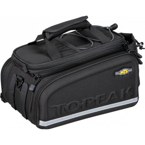 Dual molded side panels combine with flexible 600 denier fabric to form a semi-rigid, weather resistant trunkbag. Divided main compartment and side panels expand for extra storage capacity. Rear water bottle holder lets you carry more water on extended trips. Attaches to a rack with straps.