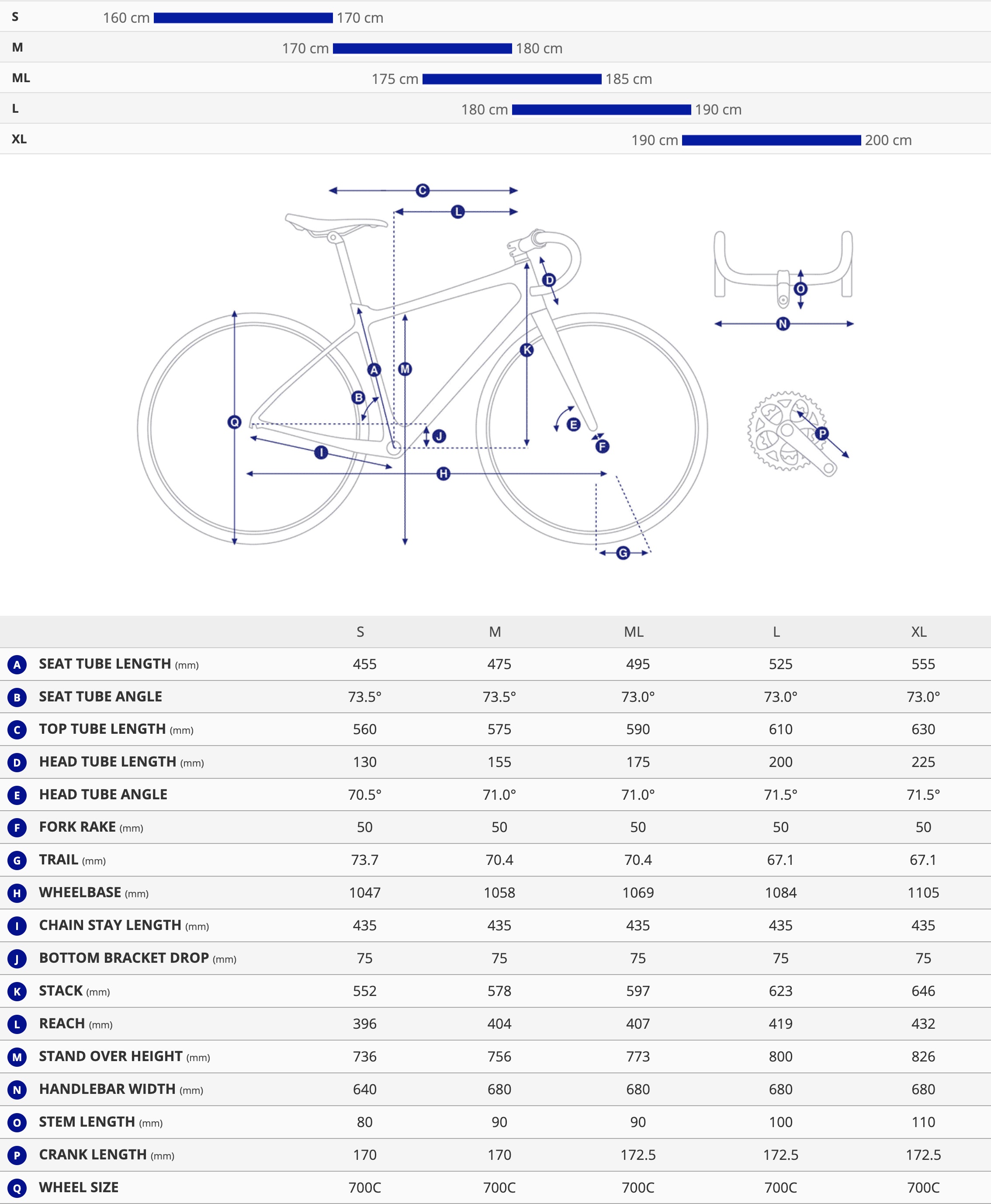 - Crankset: FSA Omega AGX+, 42t XS:170mm, S:170mm, M:170mm, M/L:172.5mm, L:172.5mm, XL: 175mm