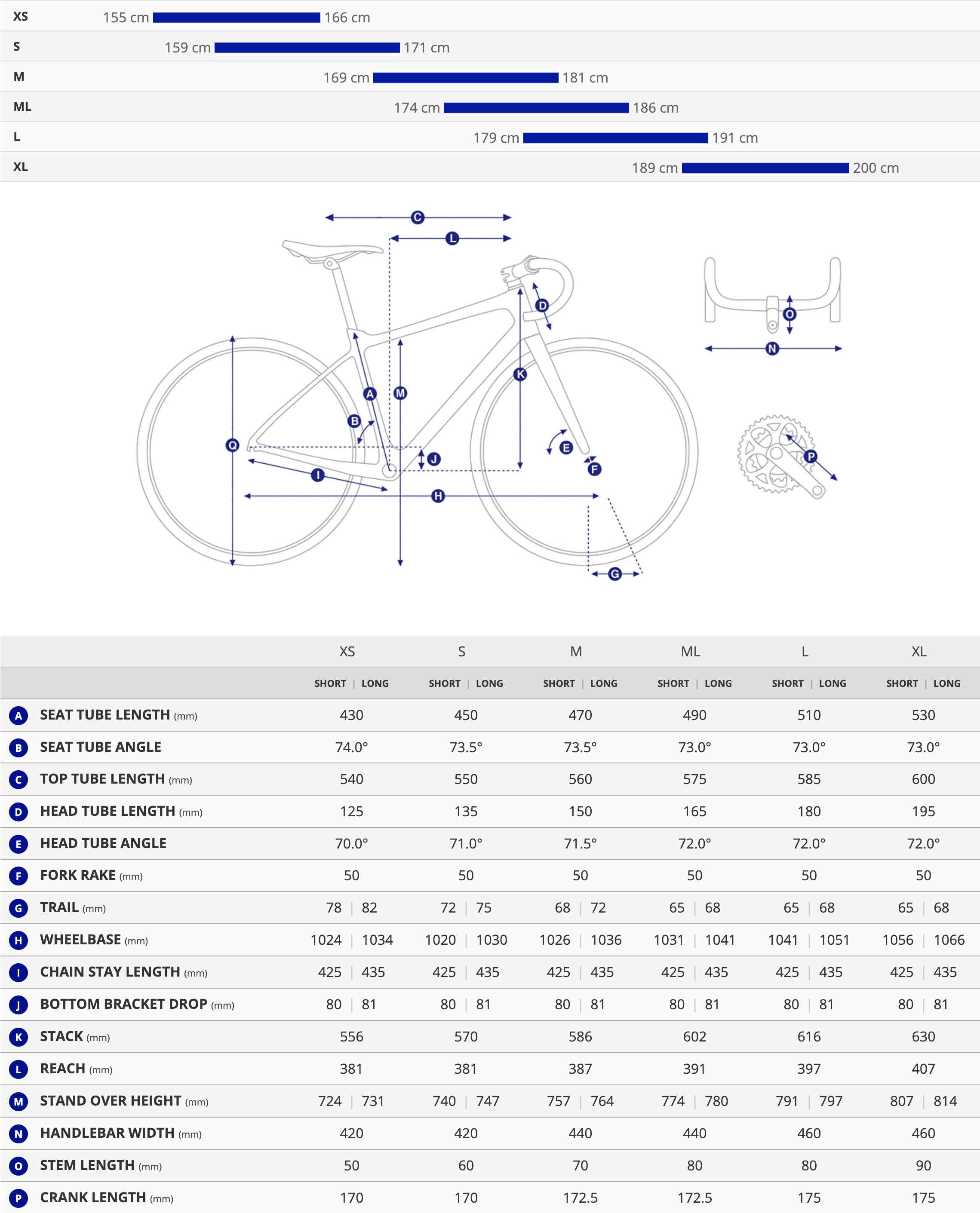 - Crankset: Shimano FC-RX610-2, 30/46 XS:170mm, S:170mm, M:172.5mm, M/L:172.5mm, L:175mm, XL:175mm