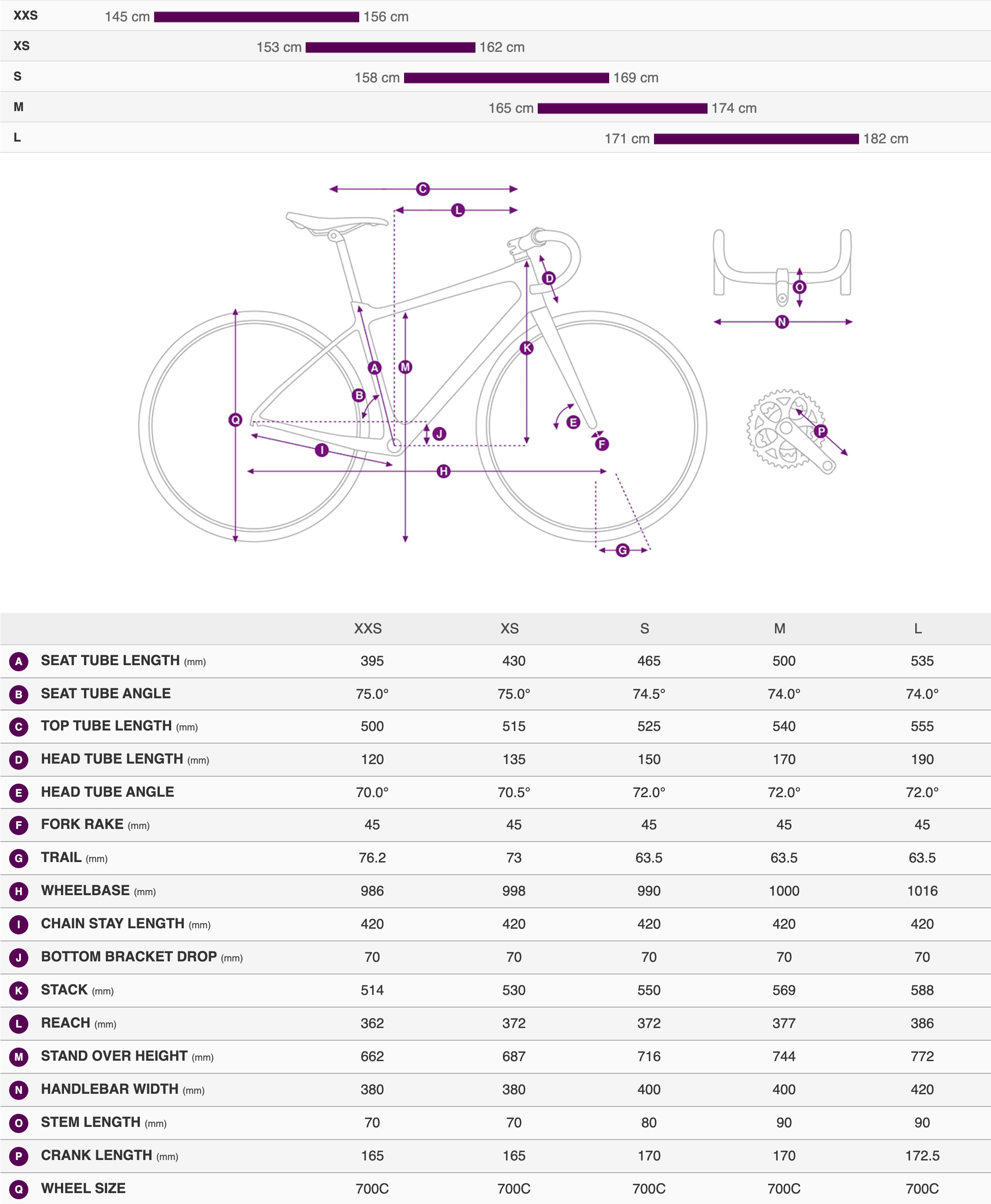 - Crankset: FSA Tempo, 34/50 XXS: 165mm, XS: 165mm, S: 170mm, M: 170mm, L: 172.5mm