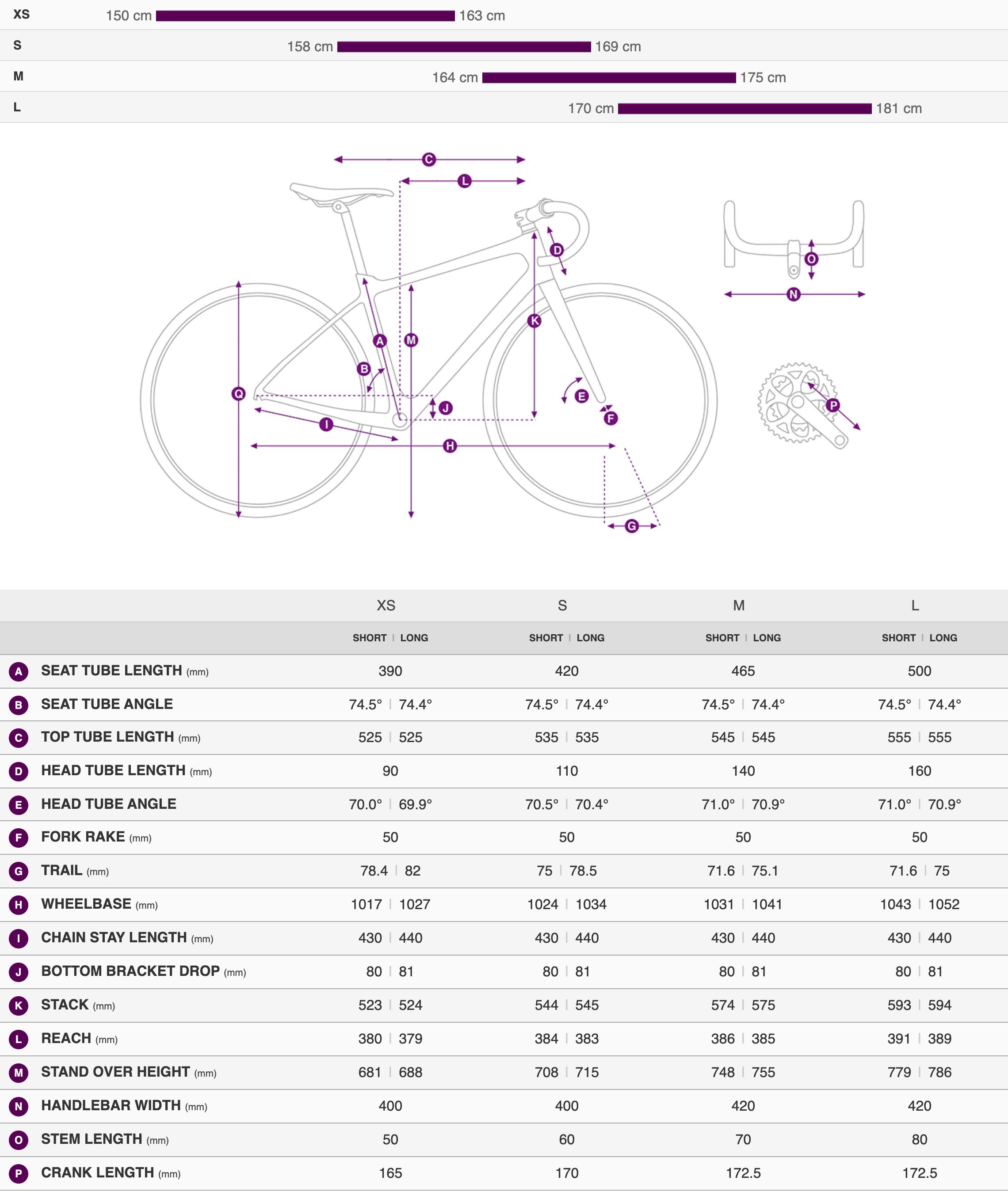 - Crankset: Shimano FC-U6030, 32/46, XS: 165mm, S: 170mm, M: 172.5mm, L: 172.5mm