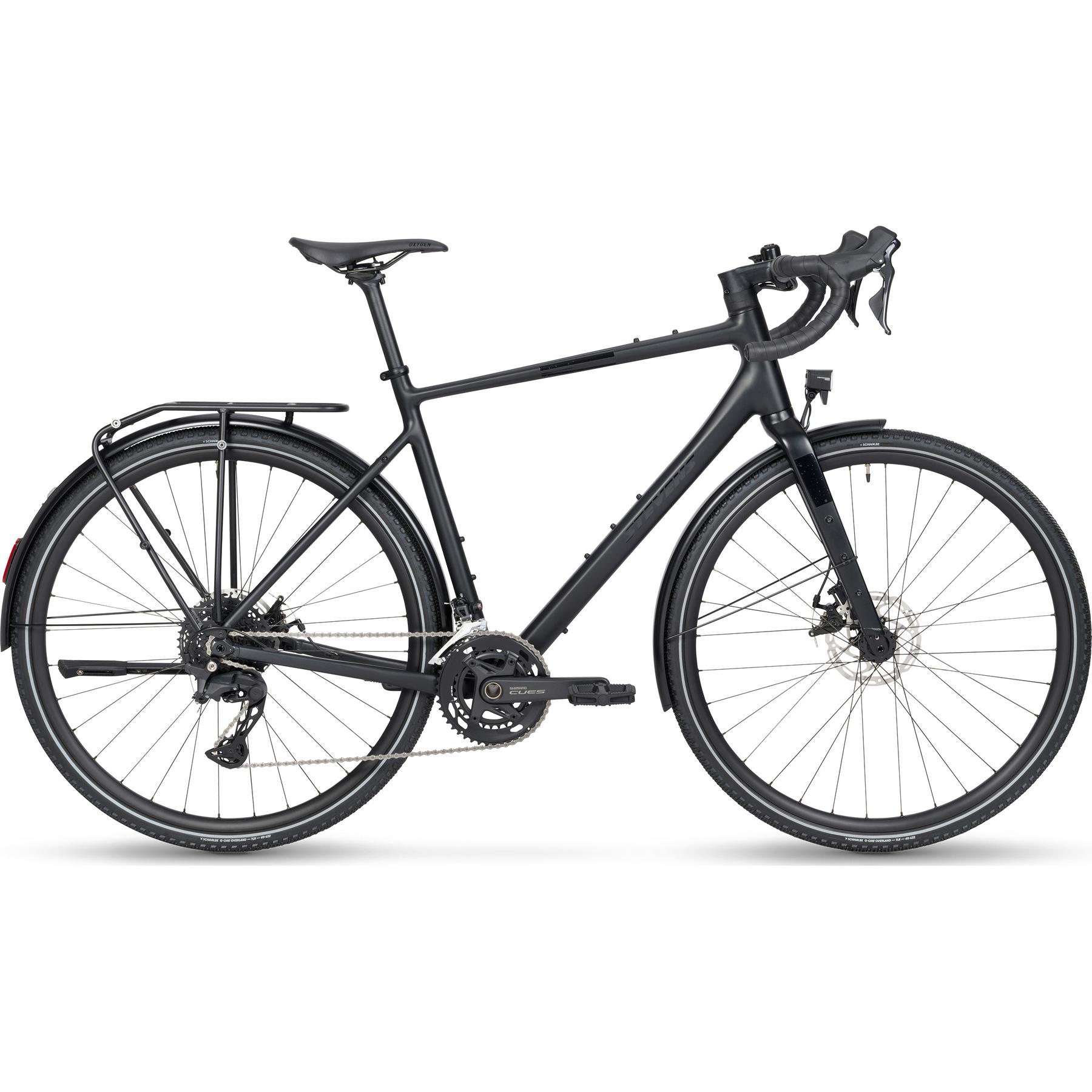 The Gavere FEQ is the everyday racer for fast commutes, after-work gravel rides, or bikepacking adventures. The elegant aluminum frame in STEVENS Stealth Black with a lightweight aluminum fork ensures smooth and comfortable riding thanks to its relaxed geometry. Robust gravel wheels with 40 mm Schwalbe G-One Overland tires offer grip and control on asphalt, gravel, and off-road. Shimano CUES 2x10 drivetrain and Tektro disc brakes guarantee reliable riding. The FEQ version impresses with extensive everyday equipment, including a rear carrier and hub dynamo LED lights, as well as versatile packing options for weekend tours.