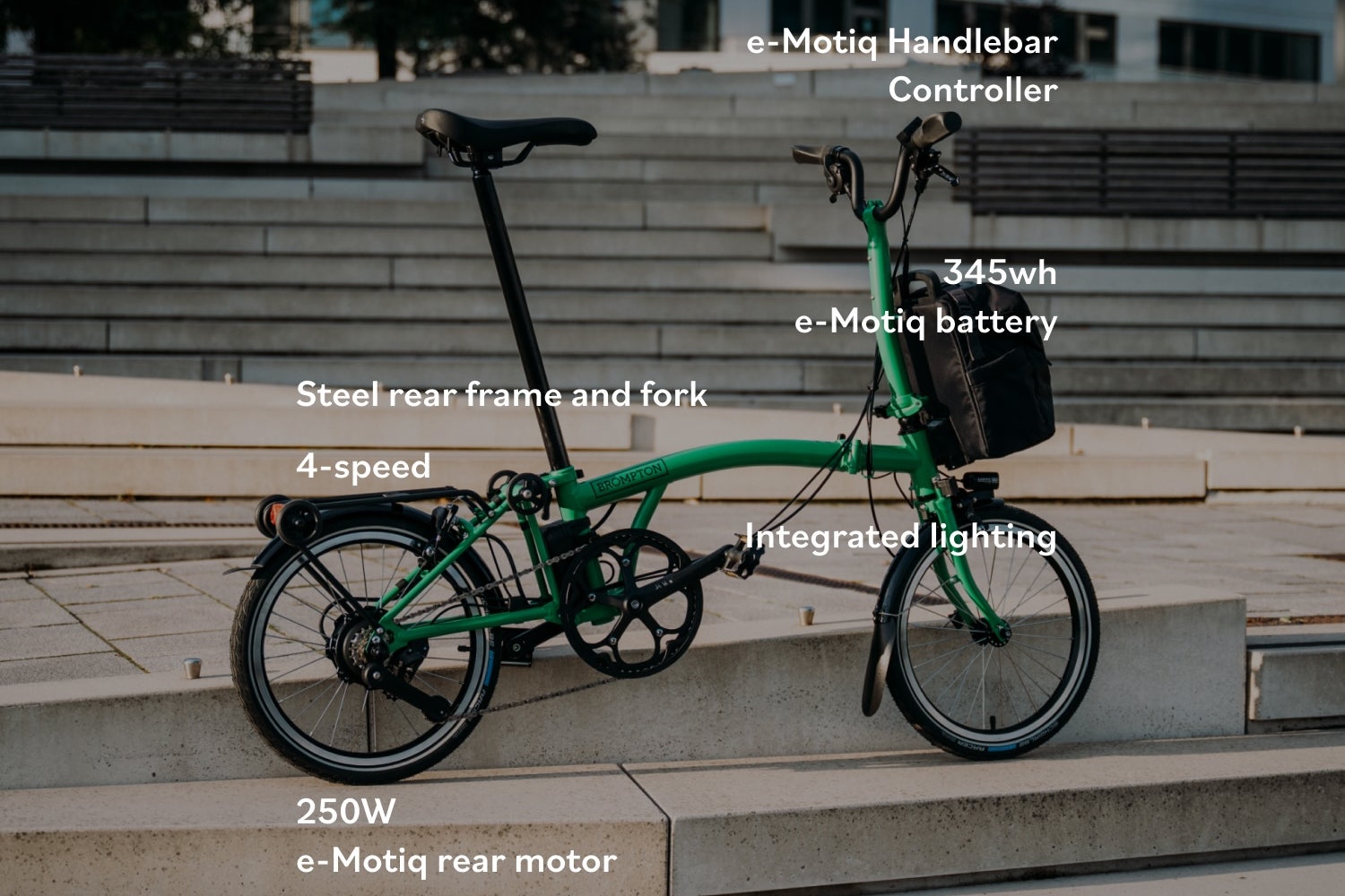 - Brompton e-Motiq system: The smart new electric system, engineered by Brompton for Brompton. First seen and proven on G Line, and now available on C, P and T Line.