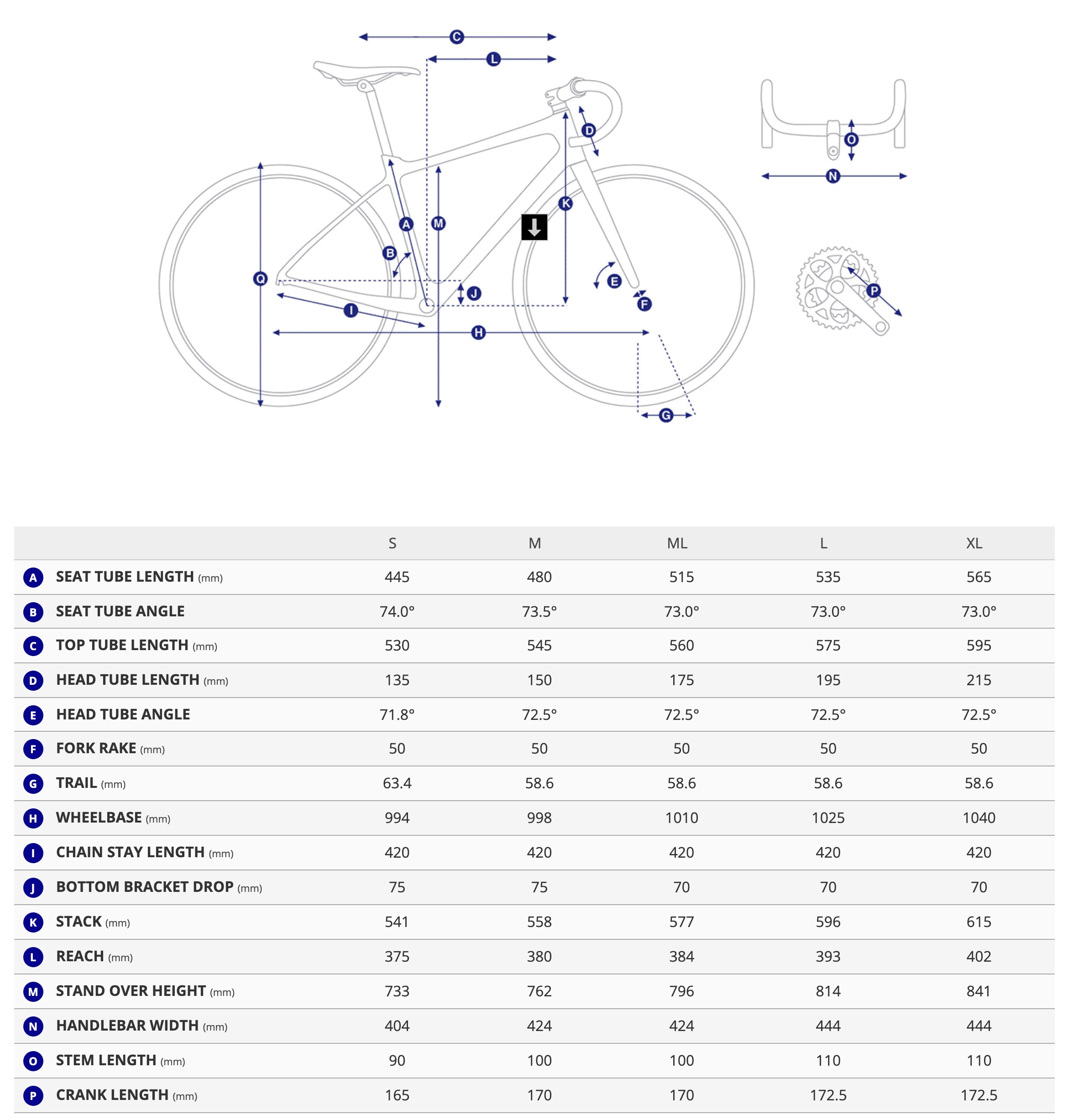 - Crankset: Shimano 105, 34/50 XS:165mm, S:165mm, M:170mm, M/L:170mm, L:172.5mm, XL:172.5mm
