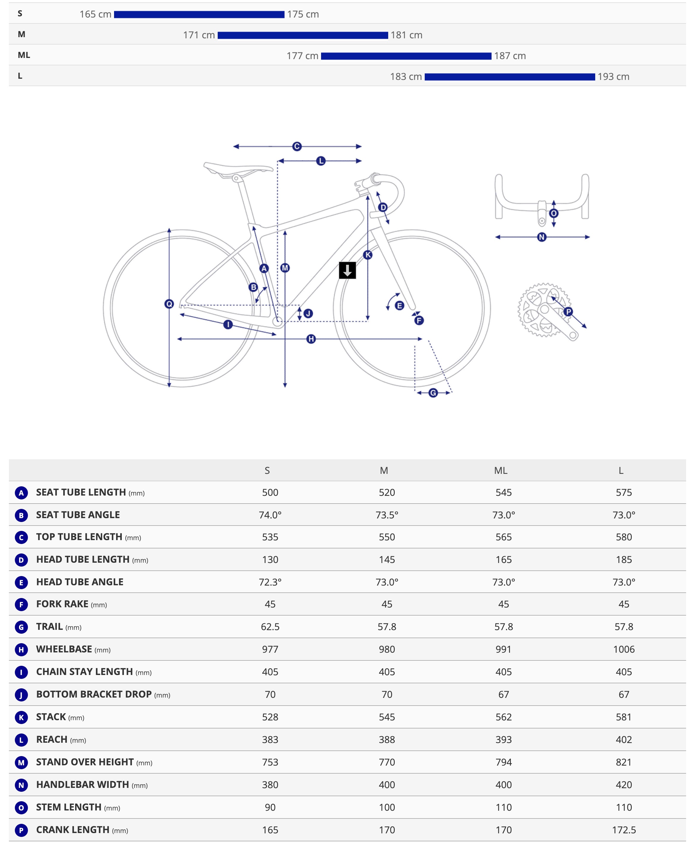 - Handlebar: Giant Contact SLR Aero XS:38cm, S:38cm, M:40cm, M/L:40cm, L:42cm, XL:42cm
