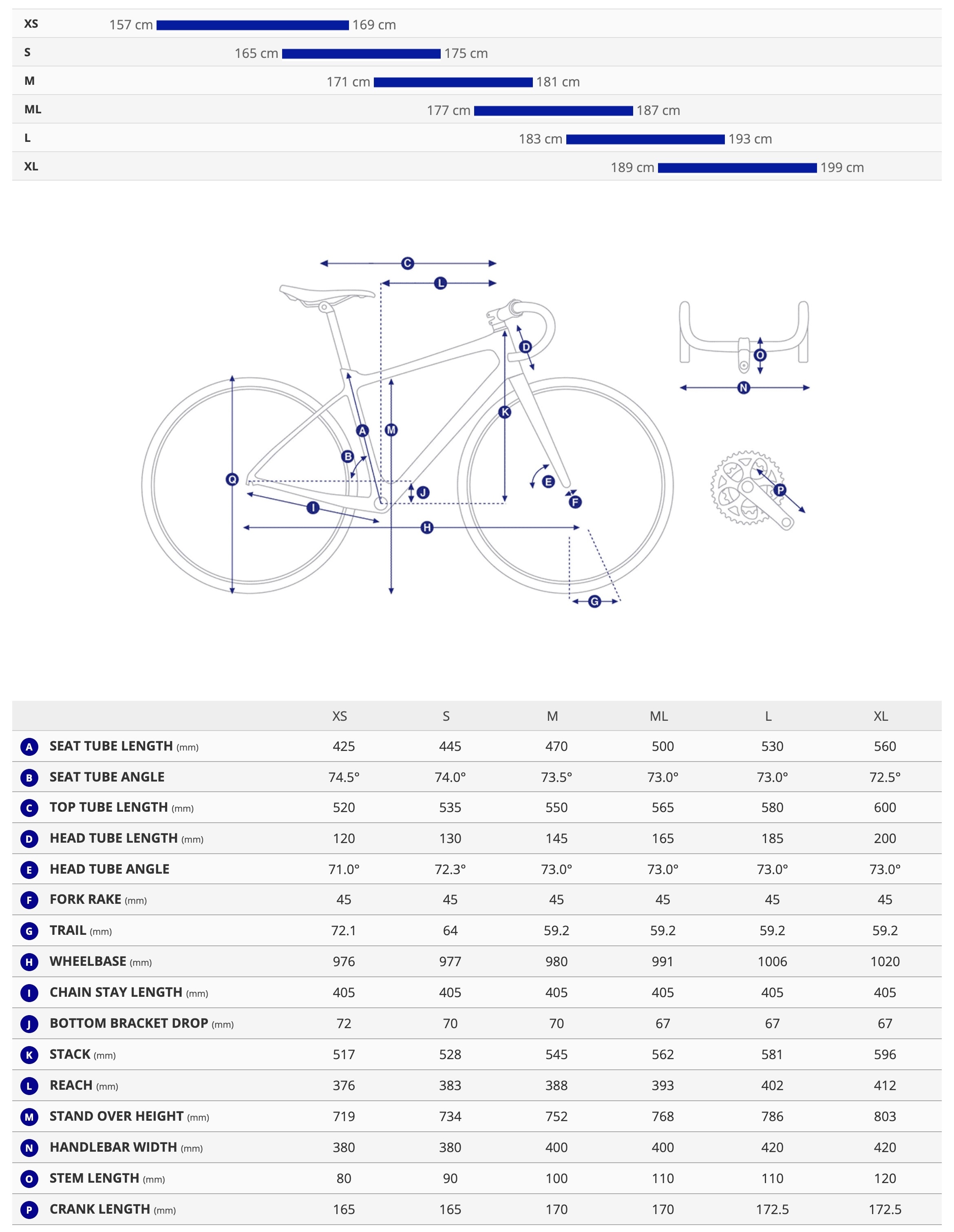 - crankset: shimano 105, 36/52 xs:165mm, s:165mm, m:170mm, m/l:170mm, l:172.5mm, xl:172.5mm