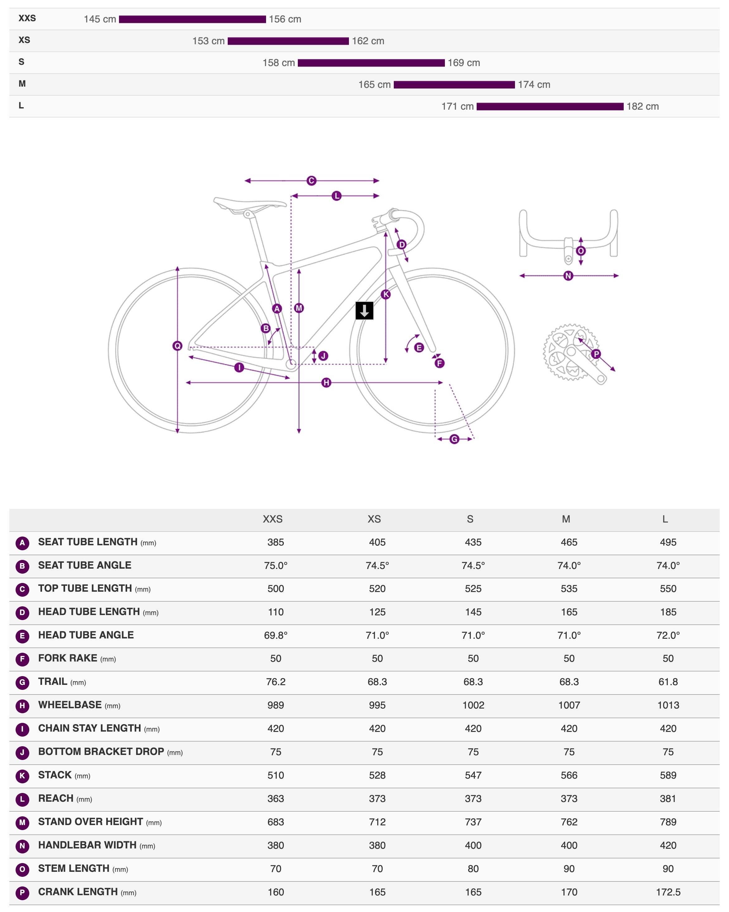 - Crankset: Shimano 105, 34/50, XXS: 160mm, XS: 165mm, S: 165mm, M: 170mm, L: 172.5mm