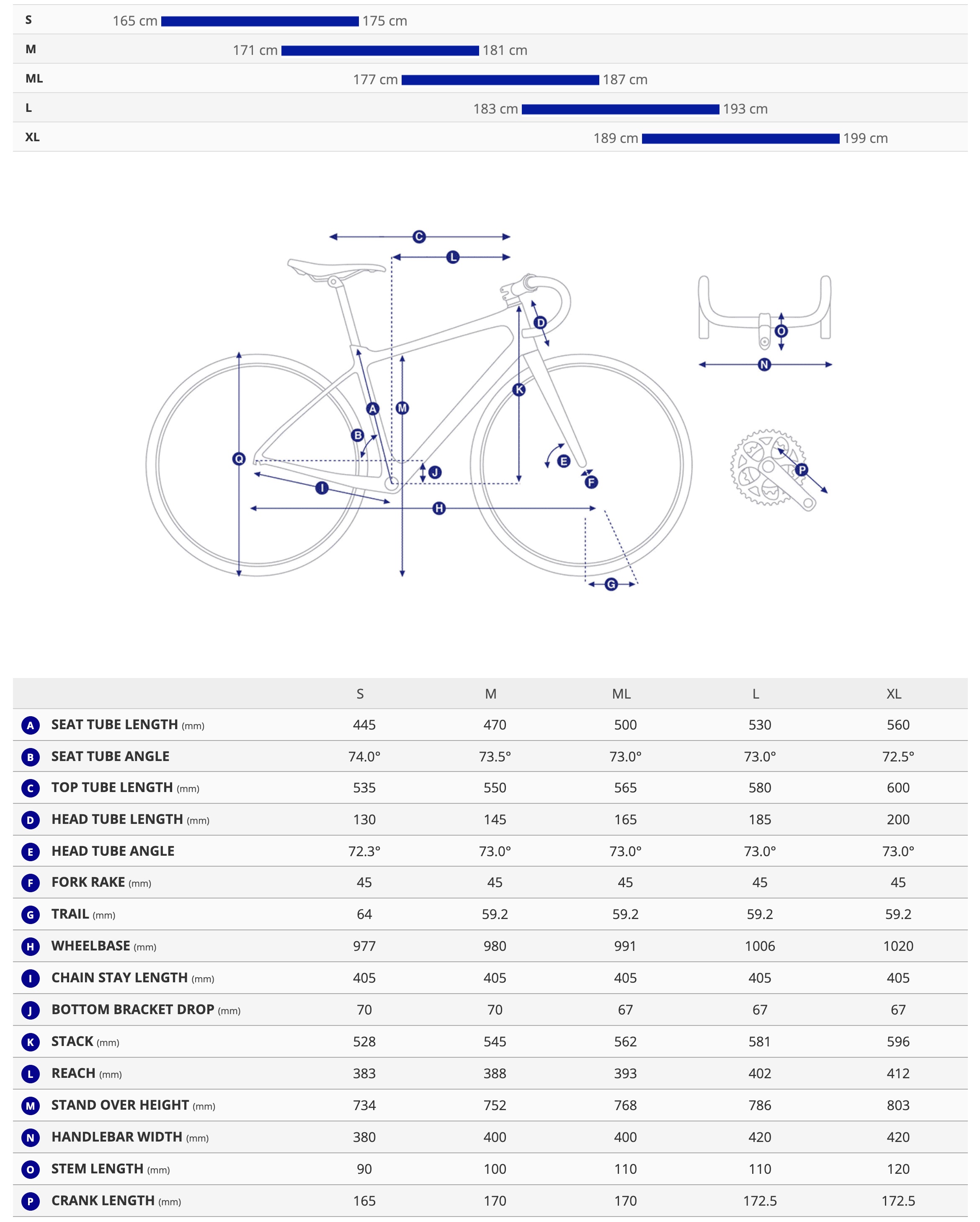 - Crankset: Shimano 105, 36/52 XS:165mm, S:165mm, M:170mm, M/L:170mm, L:172.5mm, XL:172.5mm