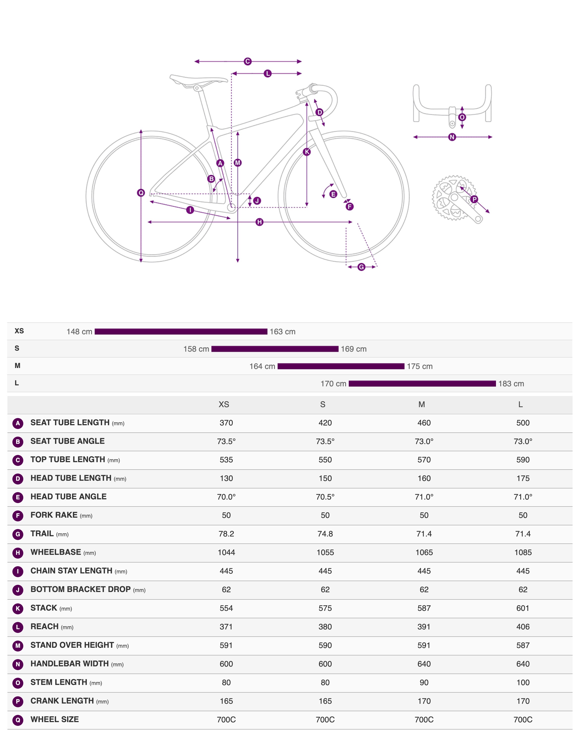 - Crankset: Forged alloy, 30/46 XS: 165mm, S: 165mm, M: 170mm, L: 170mm